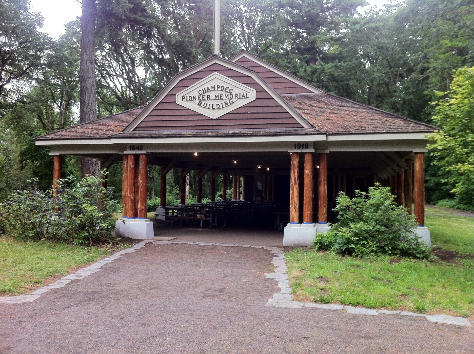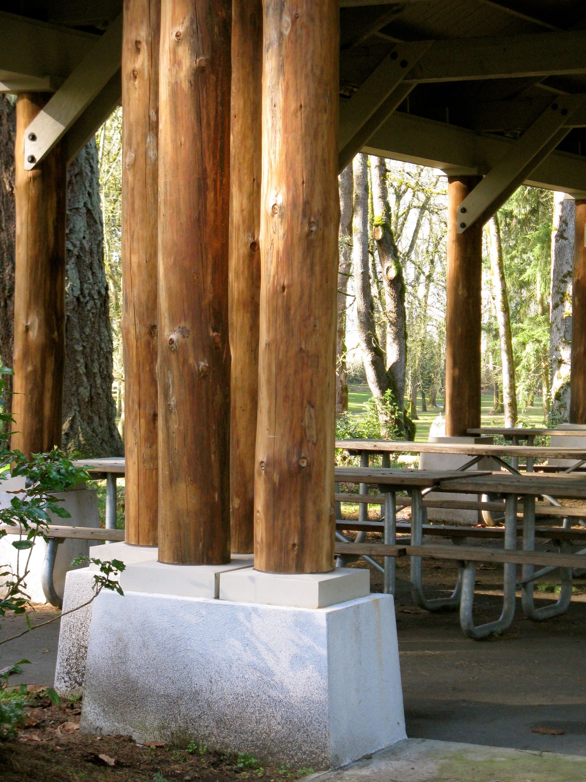 On May 2, 1843 a group of 102 farmers and trappers came together in the town of Champoeg to vote for a provisional government. This historic vote signified the creation of Oregon and was commemorated in 1901 with the dedication of Champoeg Park, which is now part of the US National Register of Historic Places. The Pioneer Memorial Building was built in 1922 to house annual celebrations honoring that momentous day in 1843. Nearly a century later, the logs and beams that provided structural support for the pavilion were heavily infested with carpenter ants. Arciform was contracted for renovation and seismic retrofitting of the historic structure. New logs were locally sourced from Silver Falls Park and installed using custom fabricated seismic hold-downs.The process included peeling the trees, then lifting and supporting the structure while the old creosote-treated logs were removed. Each post base was recreated with kneebrace joinery.