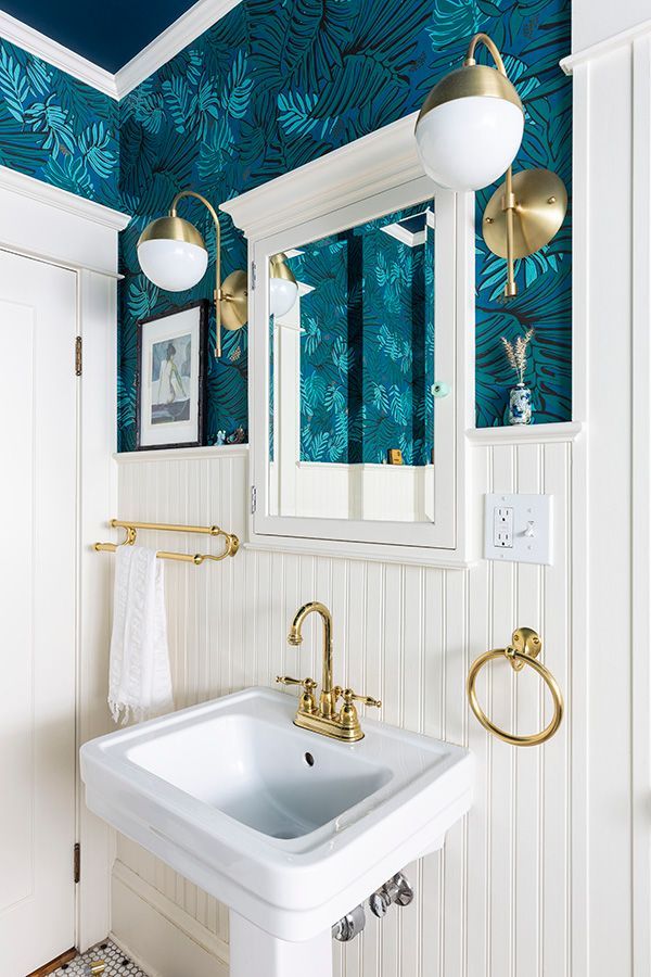 Entering from the outdoor living room, you’re welcomed into a cheery mudroom with a colorfully patterned encaustic tile floor. A repurposed Chinese screen on gliding hardware reveals custom built-in pantry shelving with intricate wallpaper at the back. A wall-mounted sink is conveniently located right near the door. The bar cabinet with an undercounter wine fridge is clad in salvaged paneling and is topped with marble and connects the room to the kitchen above.