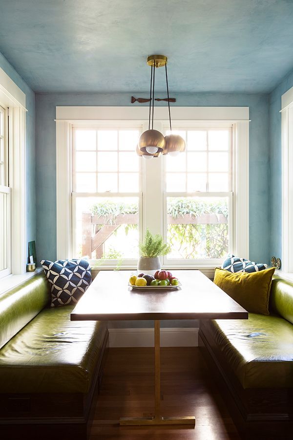 Custom-made open shelving with steel frames and reclaimed wood are practical and show off favorite serve-ware. Underfoot is salvaged Fir, and on the walls there’s Florence Broadhurst’s Egrets wallpaper, tinted plaster and ceramic subway tile. Arciform paneled the ceiling. Small mobile islands with zinc tops offer prep space and can be tucked away when entertaining. In the new kitchen nook, a custom table with a brass leg is surrounded by cozy upholstered benches.