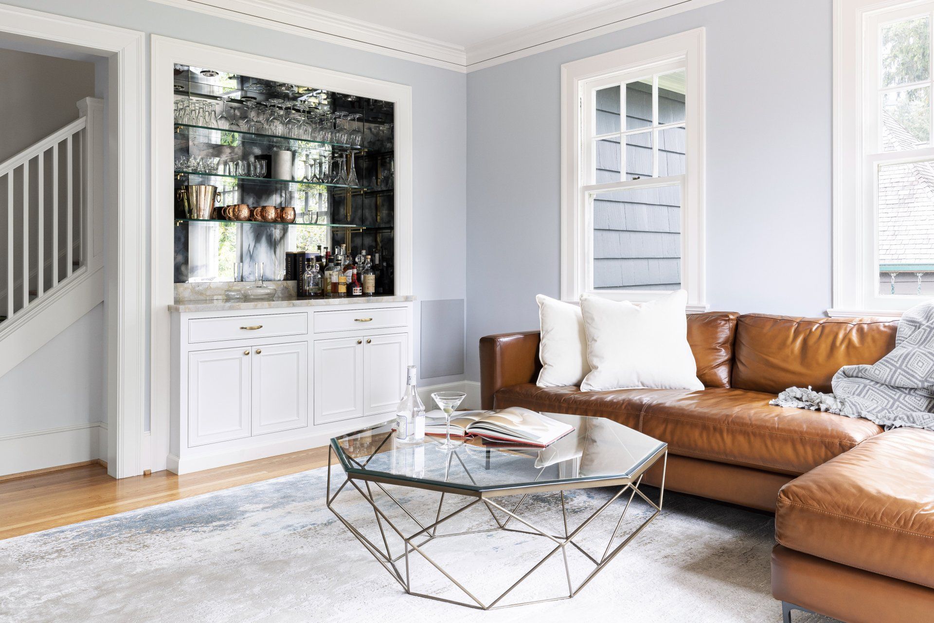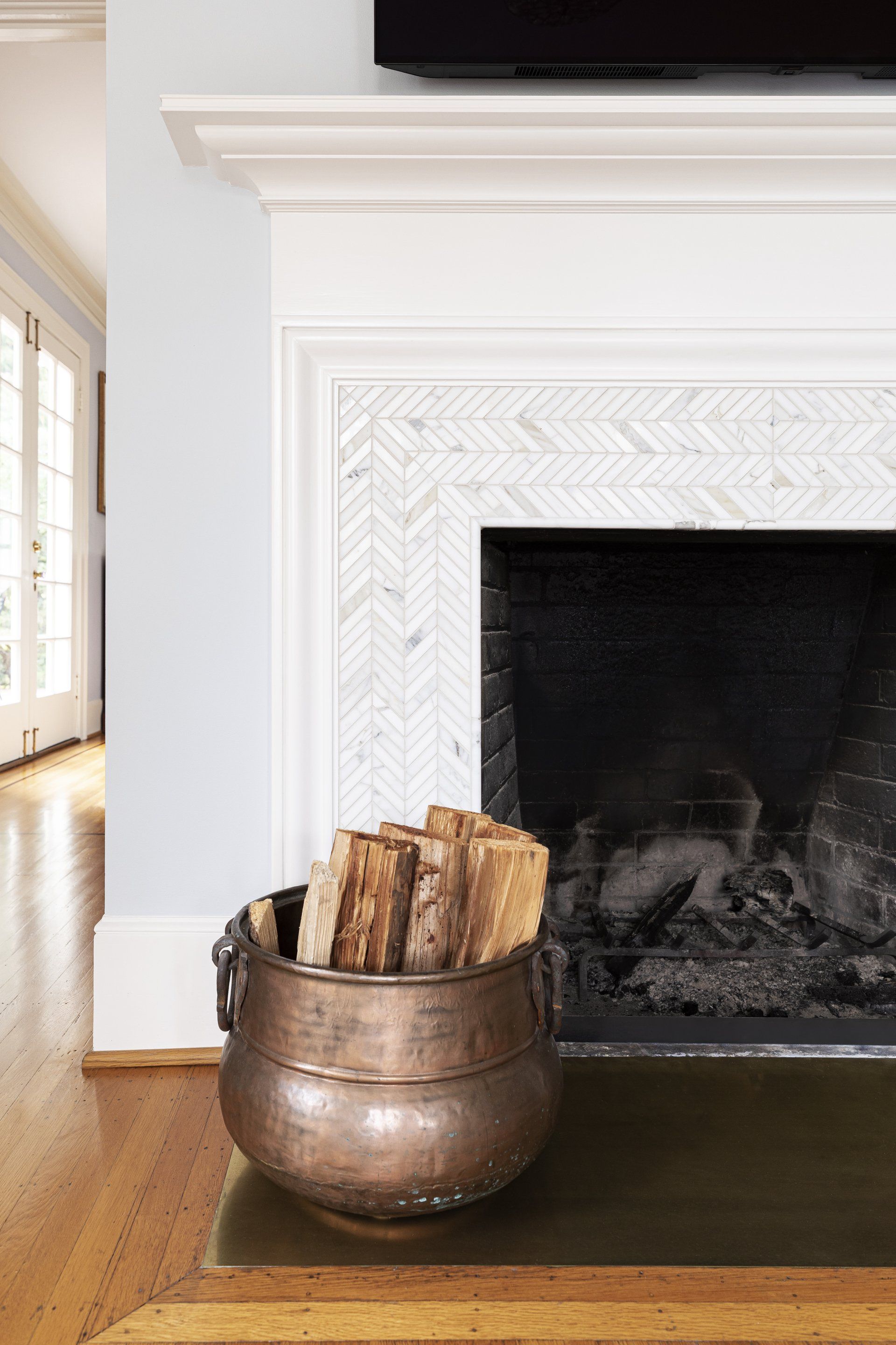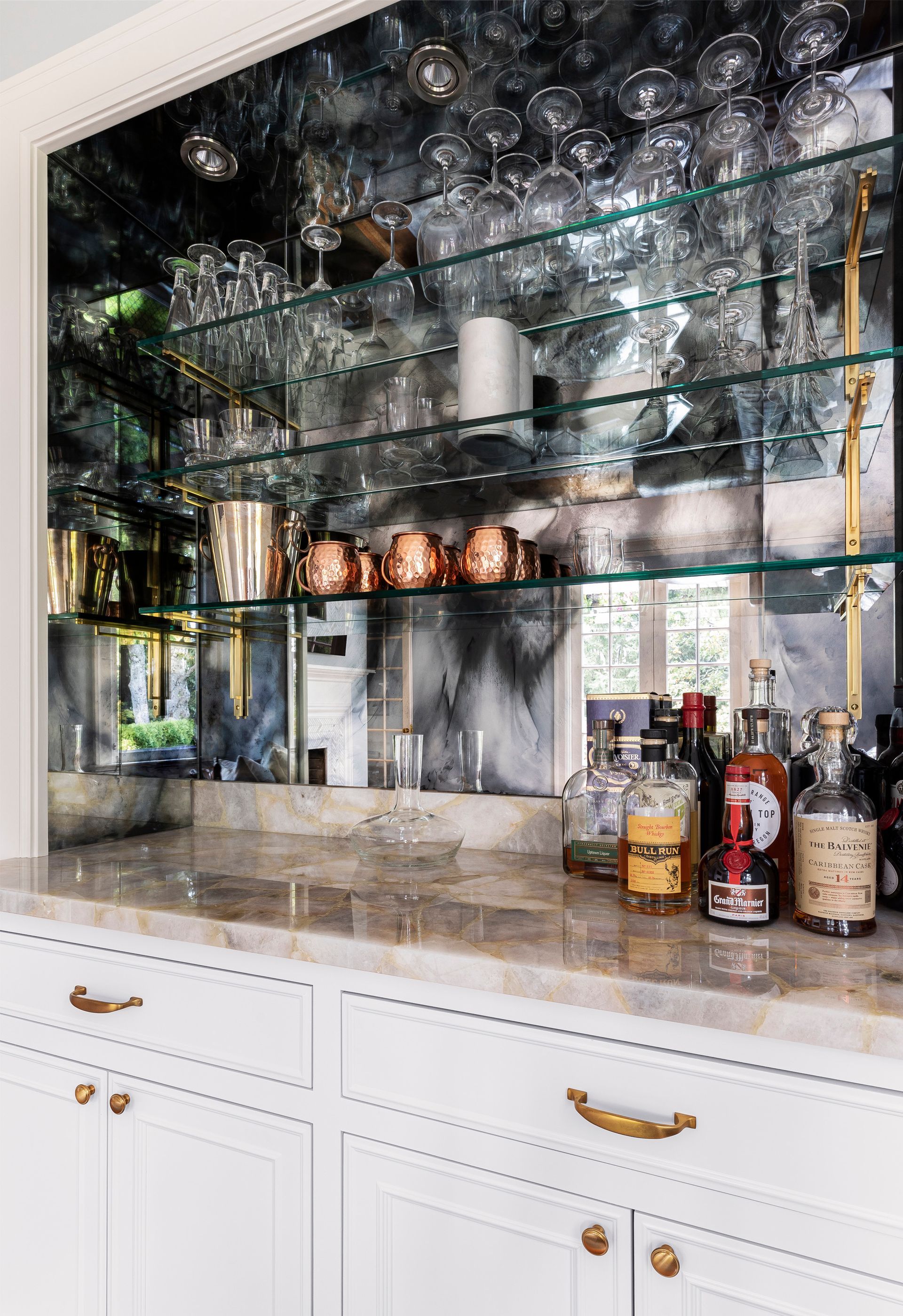 In the den, now visually connected with the kitchen, we built in a shimmery bar tucked into the deep wall that is the plumbing chase for the remodel of the main bathroom above, which is scheduled to start in 2025. We also improved the fireplace surround by adding beautiful tile and a brass hearth.