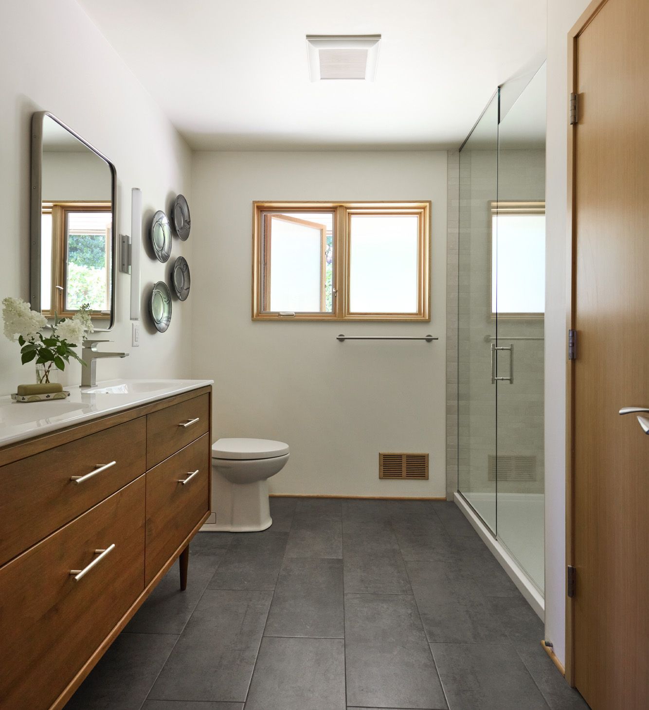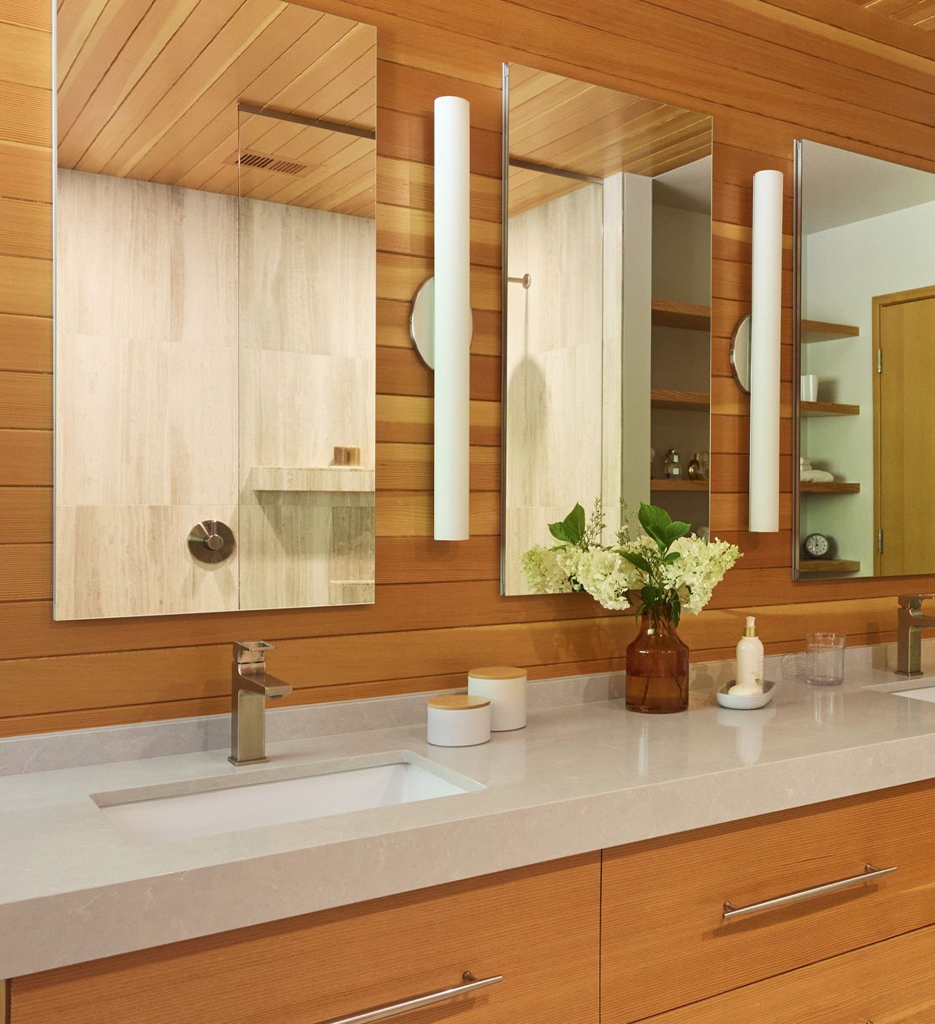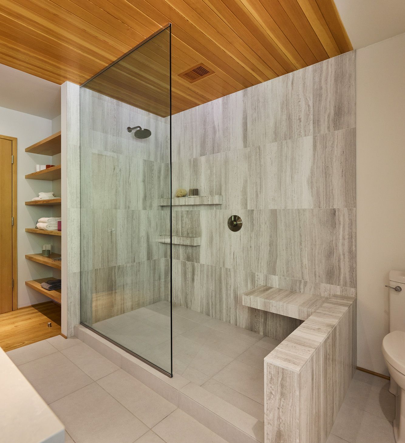 In the shower, simple detailing and thoughtful use of materials help define each function of the room, resulting in a bathroom that feels both spacious and comfortable.