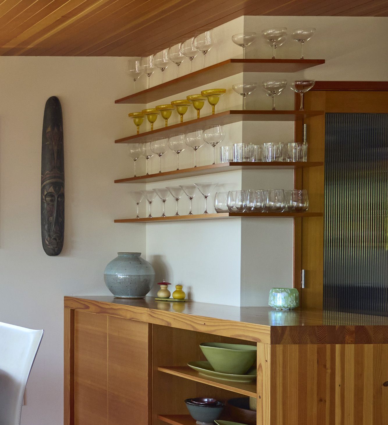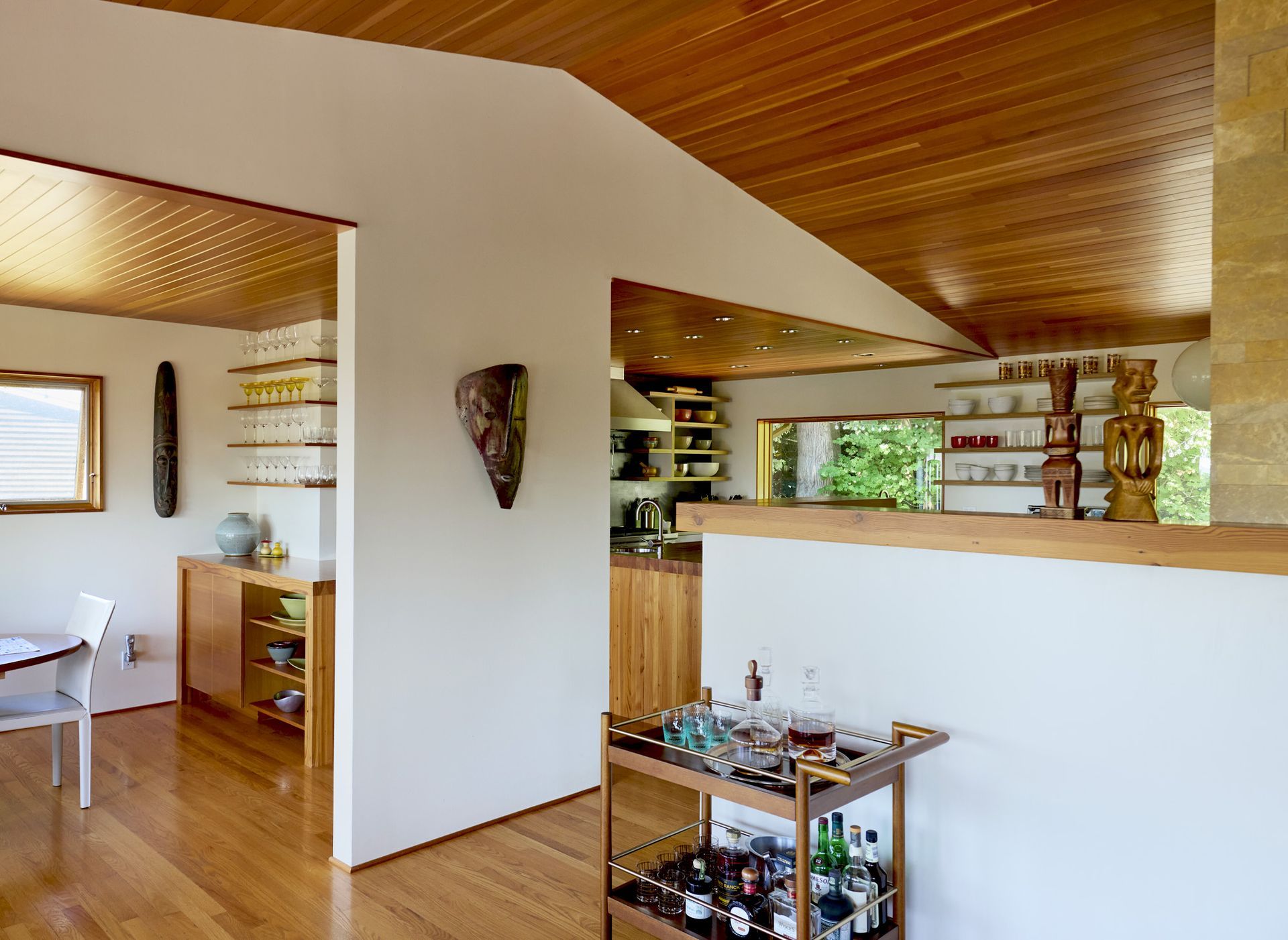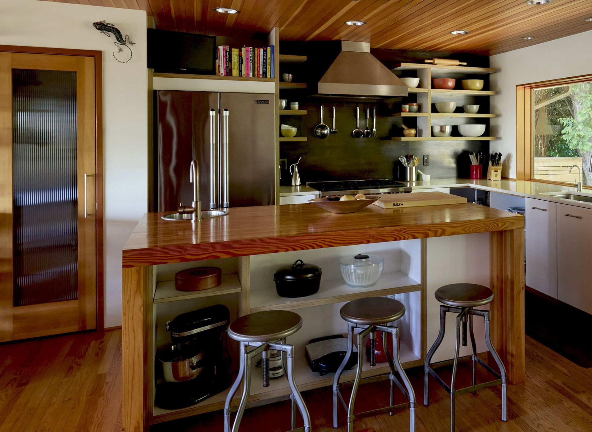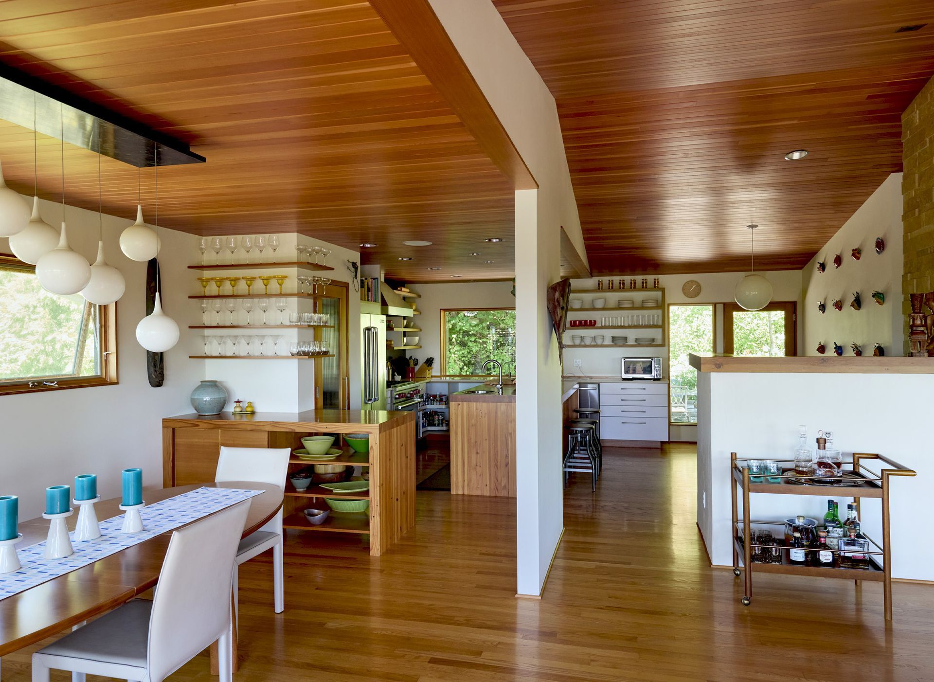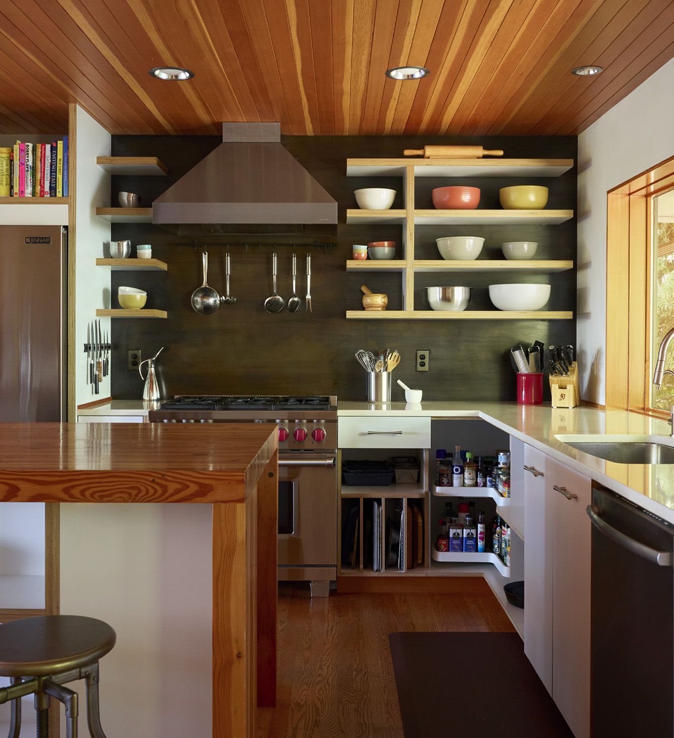 For the dining area, Arciform’s woodshop built a custom bar with open shelving above and storage below. A waterfall butcher block counter wraps around the bar and continues into the kitchen, visually connecting the spaces.