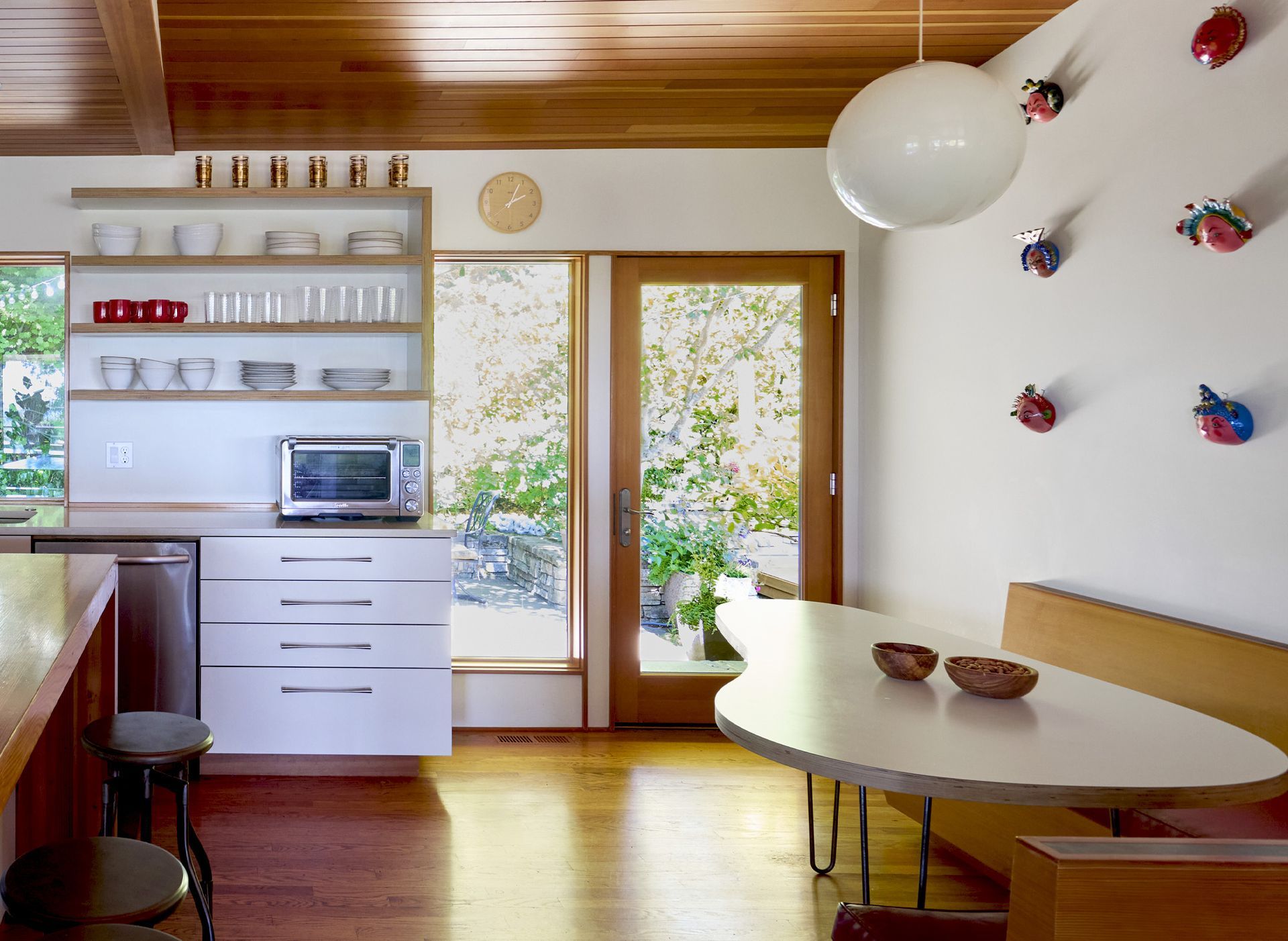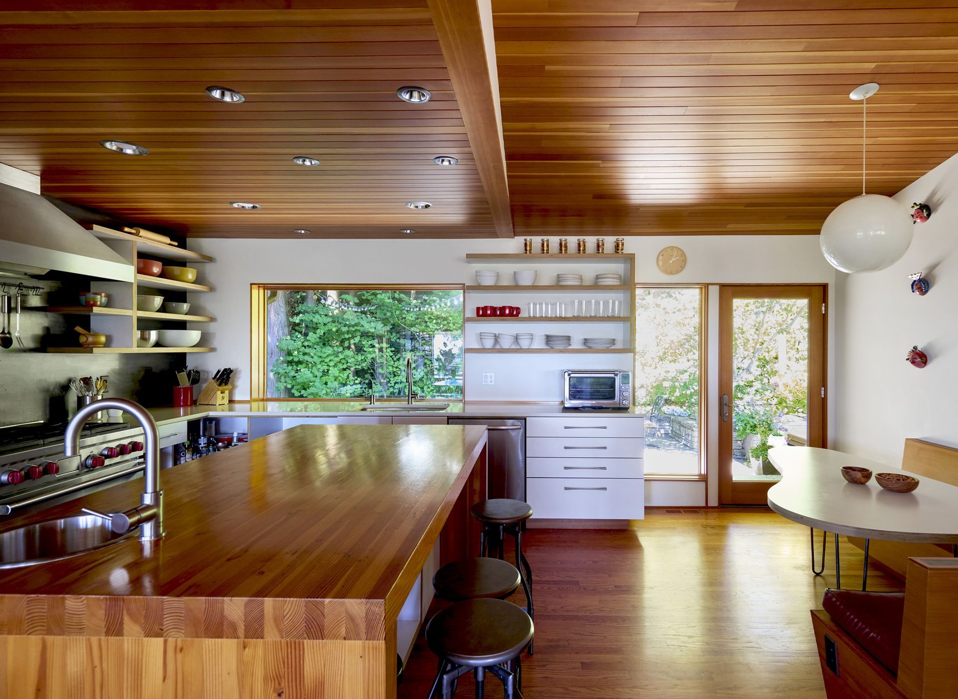 Our clients love to cook and entertain, and the kitchen was designed to support both. Open storage options both above and below the counters provide easy access to cookware and serving dishes. While the hosts are cooking, guests can gather round the kitchen island, the nearby dining table, or the curvy breakfast table built into the custom corner bench.