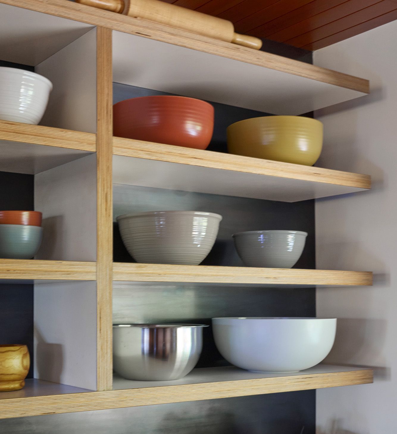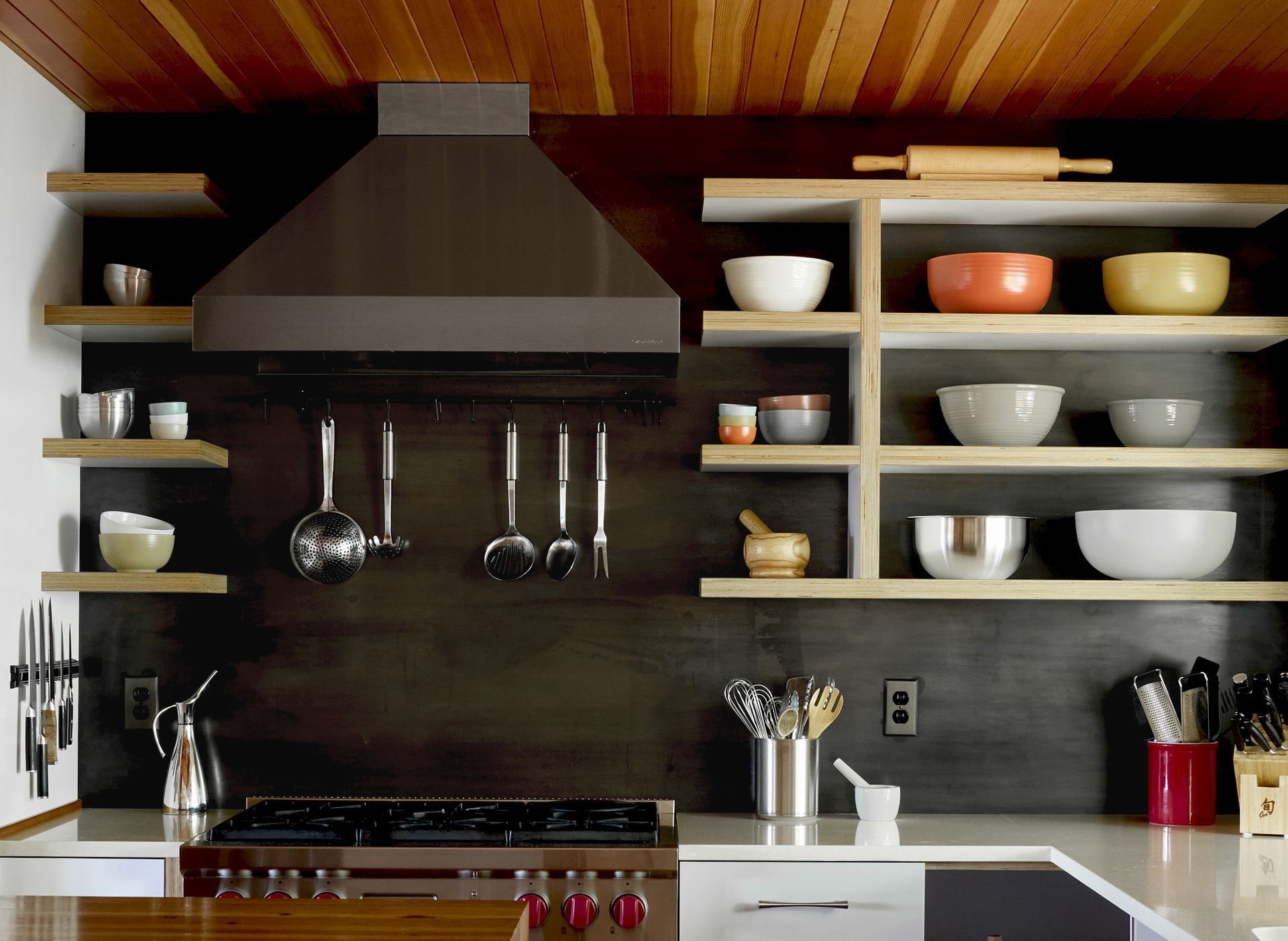 In the kitchen, a blackened steel backsplash covering the entire range wall creates a dramatic backdrop for the open shelves on either side of the hood and the white solid-surface countertops. The white-laminated, exposed-edge shelving is double thick, creating a bold grid against the dark surface. Like the custom bar, the spacious center island is built of fir butcher block with a waterfall edge. This combination of steel, fir, and smooth white surfaces carry through from the surrounding spaces, creating a cohesive material palette.