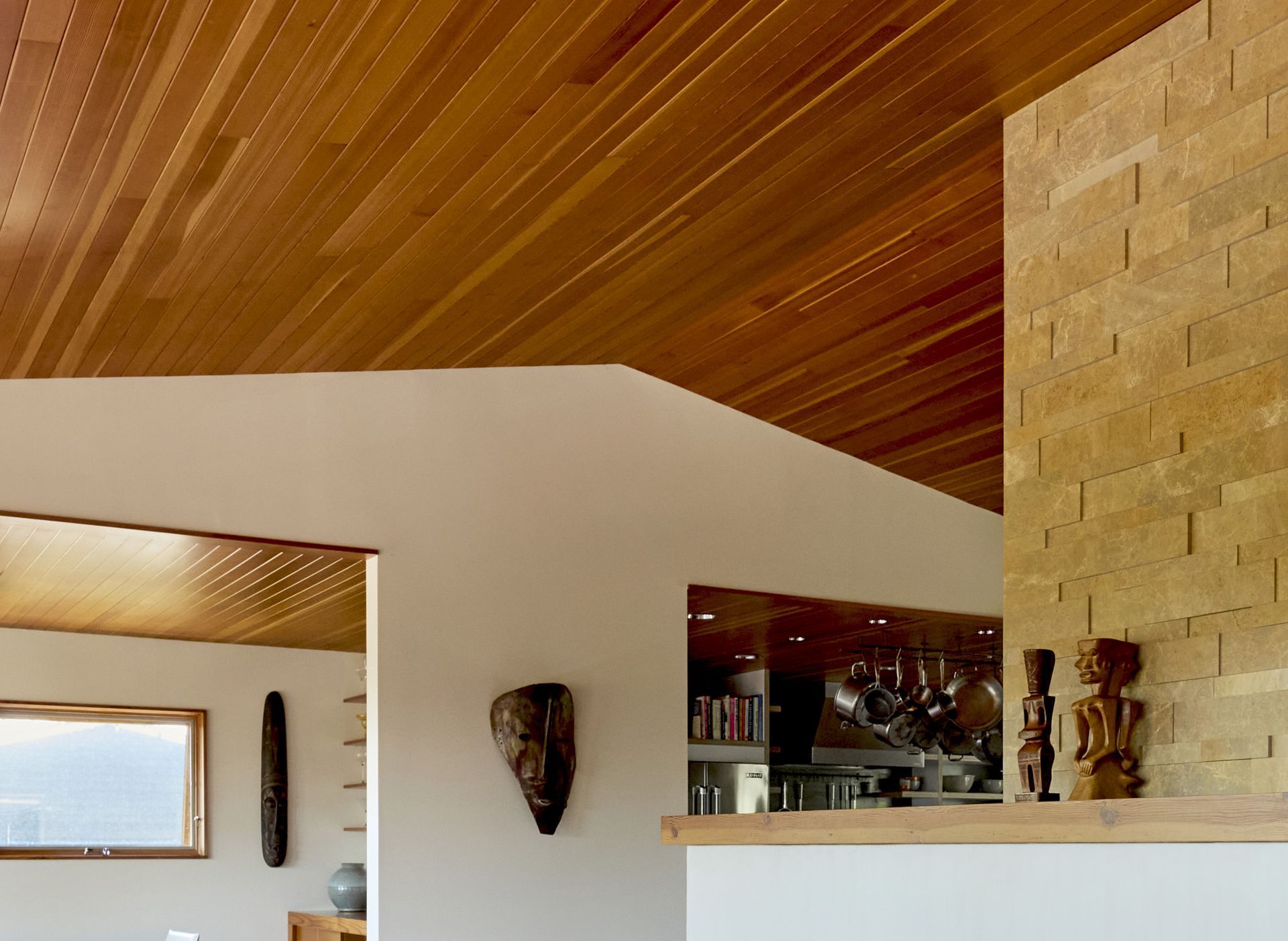 Throughout the home, the golden hues of fir millwork and oak flooring are balanced by simple white walls and natural stone tones. Together, these elements create a quiet, airy aesthetic that embraces the homeowners in comfort and light.