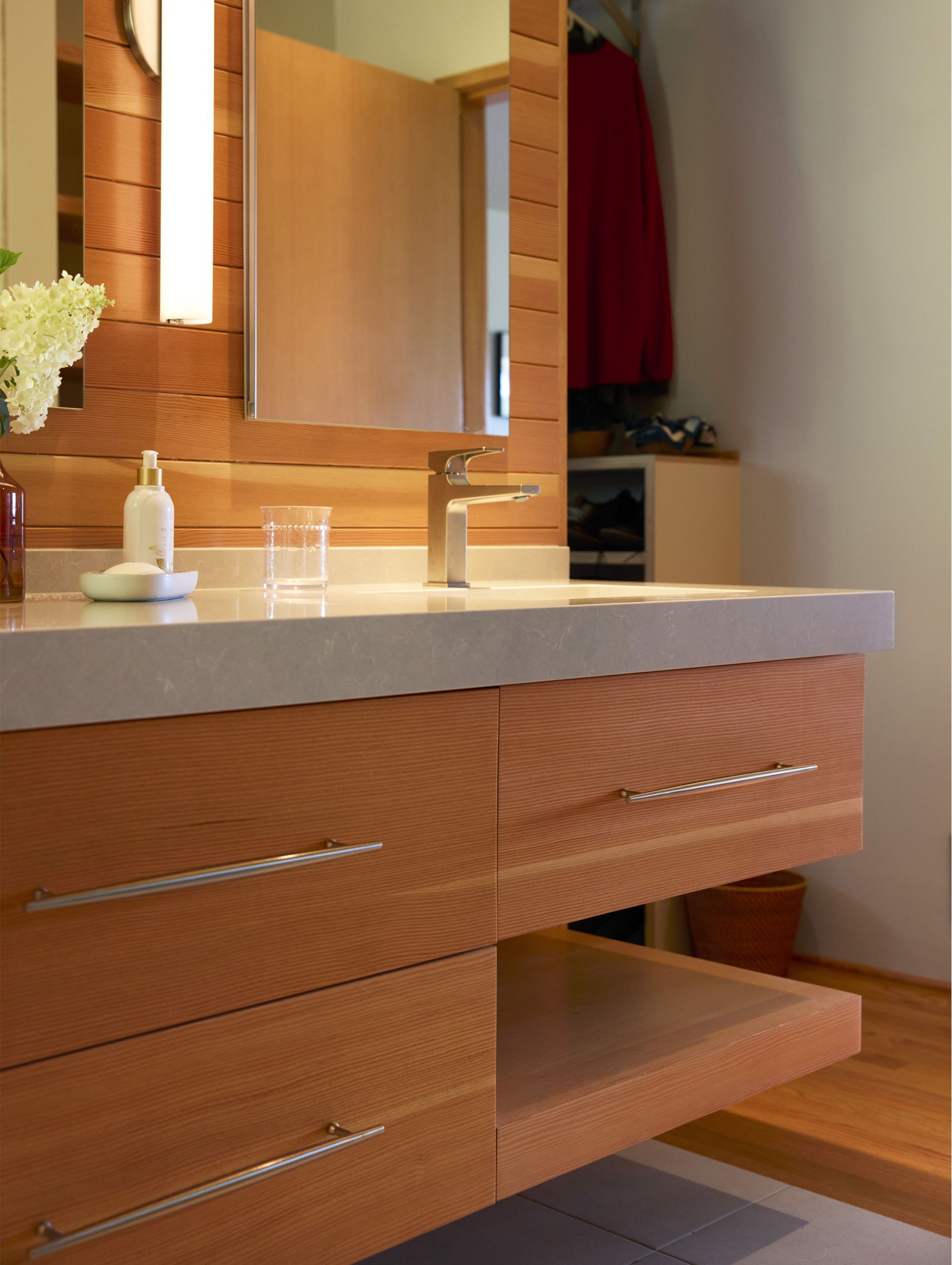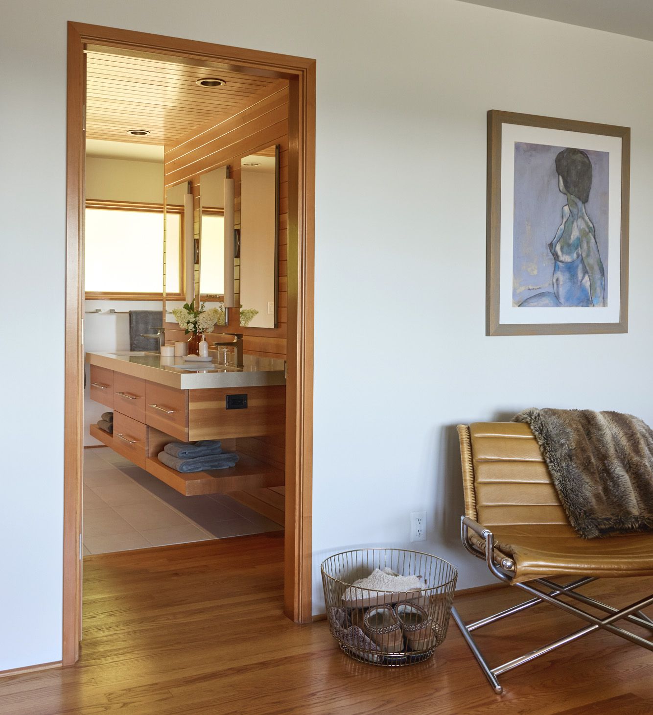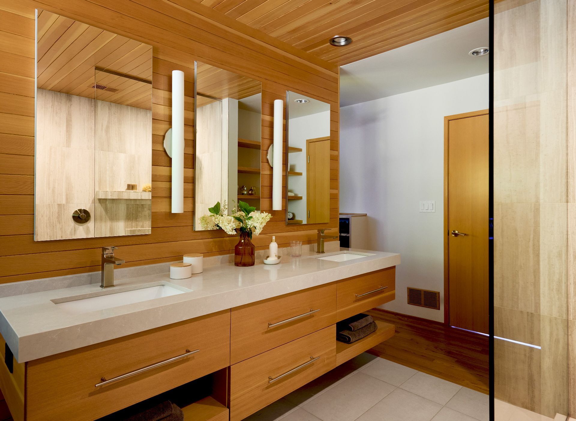 At the opposite end of the home, Arciform converted an extra bedroom adjacent to the primary bedroom into an en-suite bath and closet. A centrally located vanity wall divides the space into bathing and closet areas while allowing for easy circulation throughout. By paneling both the ceiling and the wall behind the custom floating vanity, and by limiting the number of finishes used, the vanity wall takes on a quiet, sculptural quality that adds a sense of luxury to the space.