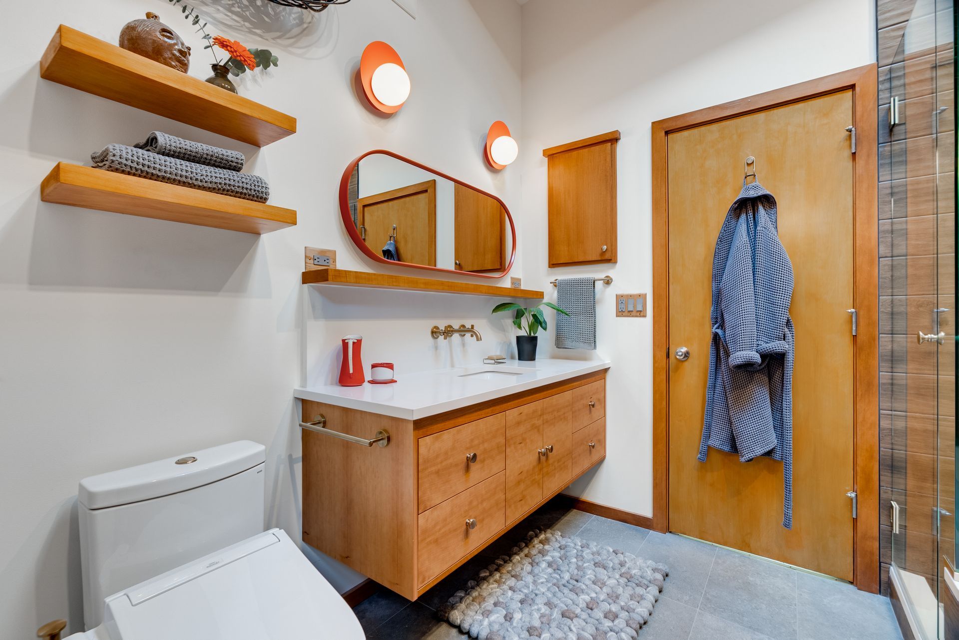 Material selections honor the home’s Mid-Century roots while introducing a calm, Japanese-inspired sensibility. We preserved the original fir doors and millwork and added a floating vanity, open shelving, and a recessed medicine cabinet that reinforce clean lines and visual lightness. Wood-look tile wraps the walls for durability and texture, while large-format porcelain flooring grounds the space. Brass fixtures add warmth.