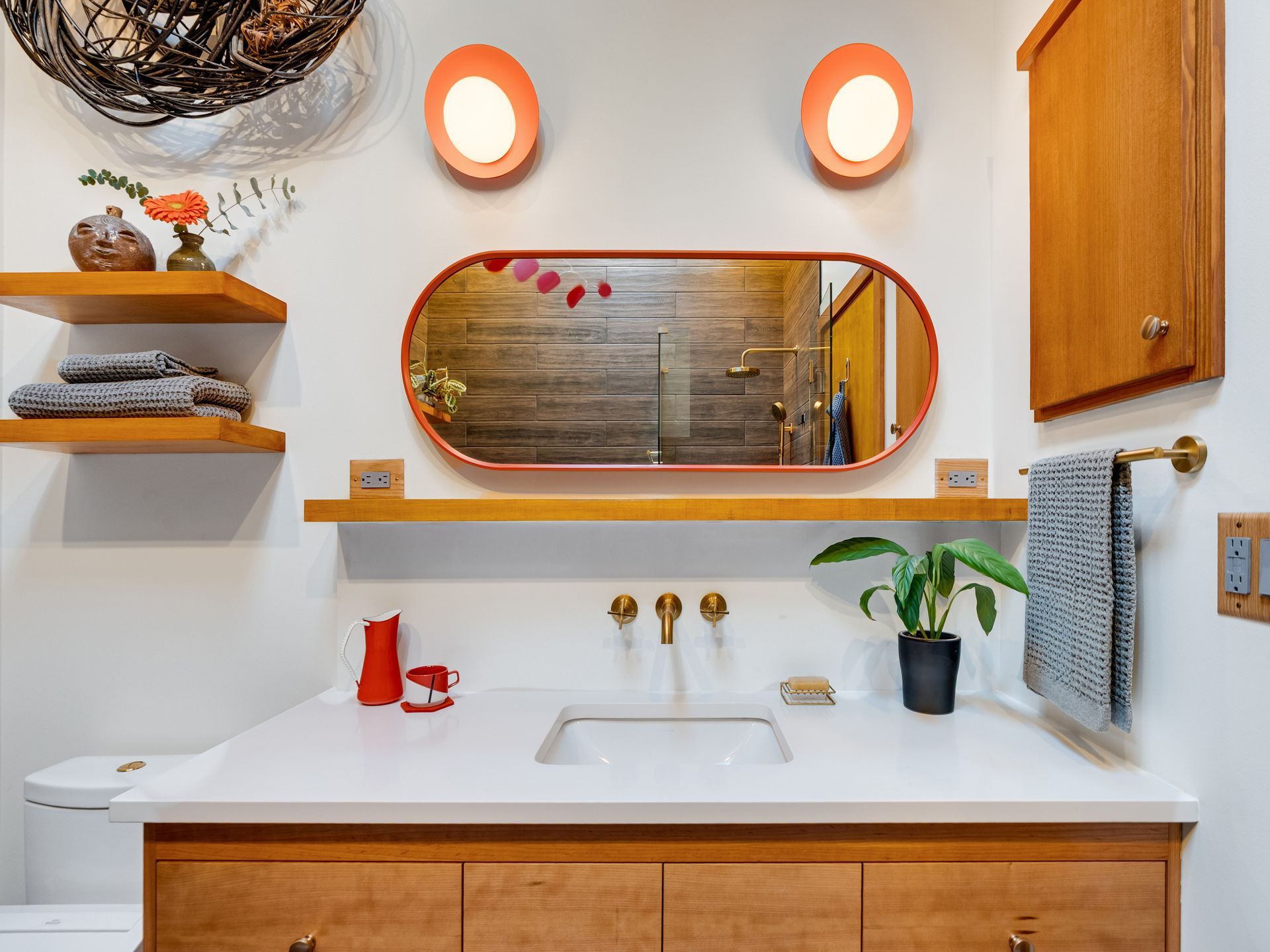 A vintage decorative tile, sourced by the clients, creates a personal moment in the tub niche. Orange sconces bring a playful pop of Mid-Century color at the vanity and draw the eye upward to the exposed beams, now painted a vibrant red.